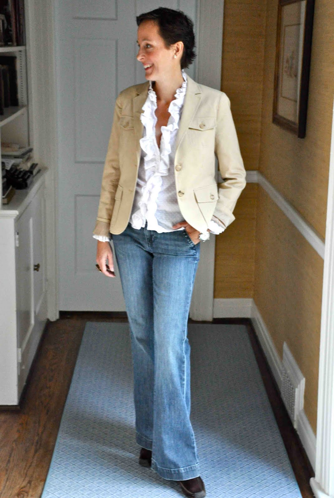 It is finally feeling just a tiny bit fallish. This is one of my go to looks for fall. Soon my blazer will change to wool. With my super short hair my ruffle blouse saves me from looking like a he. It is also the first time to wear one of my old favorites ....my pons quintana boots.